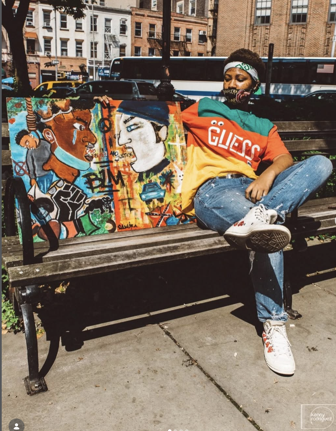 I'm Samira — NYC-based visual artist and founder of SammyBammy. My work was forged during one of the most defining moments in modern history. Here in 2020, I was 18 years old, while the world was on fire and people were dying, demanding to be seen, I was painting. I don't even remember what I called this one — I just remember being around other people making cool shit and feeling like I had something to say too. So I said it. I even decked out my mask. This painting is a memorial of the struggle we all faced during this time.