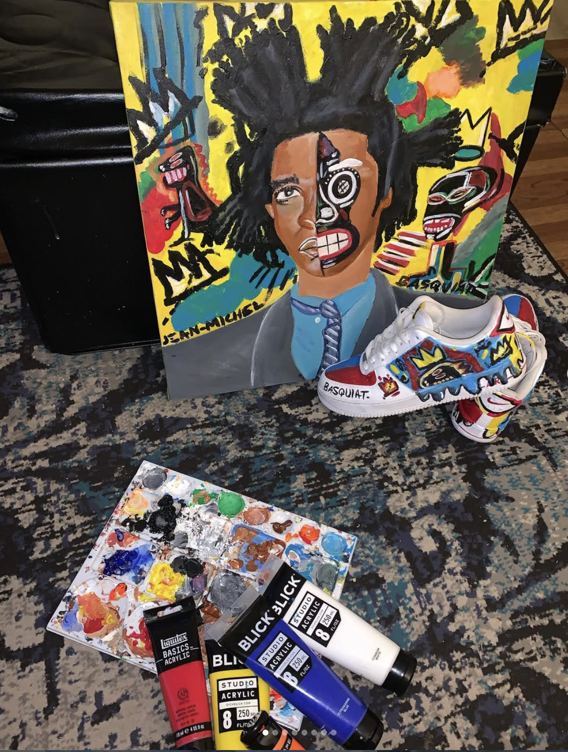 This one was made during Covid, somewhere between Zoom classes and figuring out what to do with all that time. I found a pair of AF1s a size too big and couldn't just let them sit there. So I painted those too. Acrylic on canvas, 16×16, and acrylic on whatever those sneakers were made of.